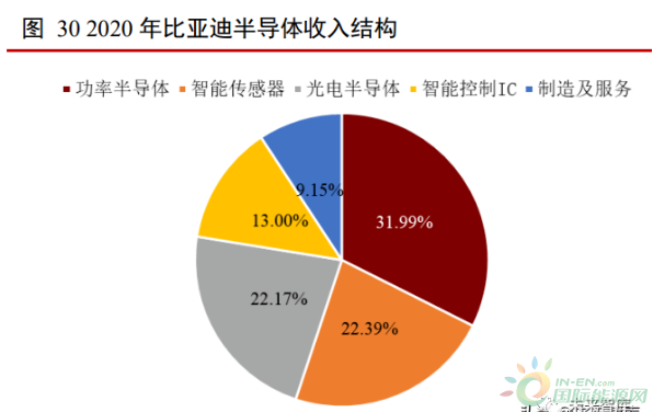 2020 年比亞迪半導(dǎo)體實現(xiàn)收入 14.41 億元,同比增長 31.46%。其中,功率半導(dǎo)體、 智能傳感器、光電半導(dǎo)體、智能控制 IC、制造及服務(wù)分別實現(xiàn)收入 4.61 億元、3.23 億 元、3.20 億元、1.87 億元以及 1.32 億元,占比分別為 31.99%、22.39%、22.17%、13.00% 以及 9.15%。