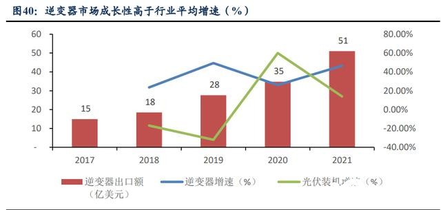 逆變器市場成長性高于行業(yè)平均增速。在全球光伏產(chǎn)業(yè)大發(fā)展的推動下,光伏逆變 器市場近年來保持了較快的發(fā)展態(tài)勢。2017 年以來全球光伏逆變器出貨量快速上漲,出 口額從 2017 年的 15 億美元上升到 2021 年的 51 億美元,年復(fù)合增長率達(dá)到 35.9%。逆 變器成長性高于光伏行業(yè)平均增速。