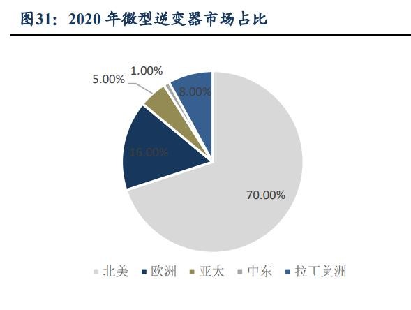 歐美 MLPE 中微逆占比不斷提升,拉丁、亞洲新興崛起帶來契機(jī)。歐美作為 MLPE 最主要出貨區(qū)域,這兩個地區(qū) MLPE 不斷加速滲透,隨著微型逆變器與優(yōu)化器之間成本 差距不斷縮小,性價比愈發(fā)凸顯,微型逆變器在 MLPE 中出貨占比不斷提升,2020 年 占比已達(dá) 31.58%,我們預(yù)計后續(xù)微逆占比仍將不斷提升。而亞洲、拉丁美洲作為微型逆 變器市場中的重要增長力量,由于政策成熟度相對較低,用戶付費能力較弱,因而成本 上具有較明顯優(yōu)勢的國內(nèi)廠商在該市場中將占有一定優(yōu)勢。