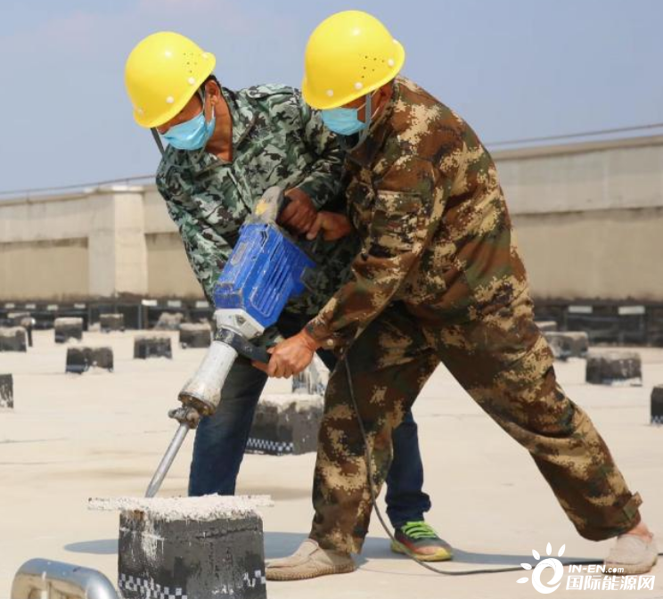 ▲ 在華能屋頂光伏發(fā)電項目施工現(xiàn)場,工人對光伏組件混凝土基礎(chǔ)設(shè)施進(jìn)行施工。