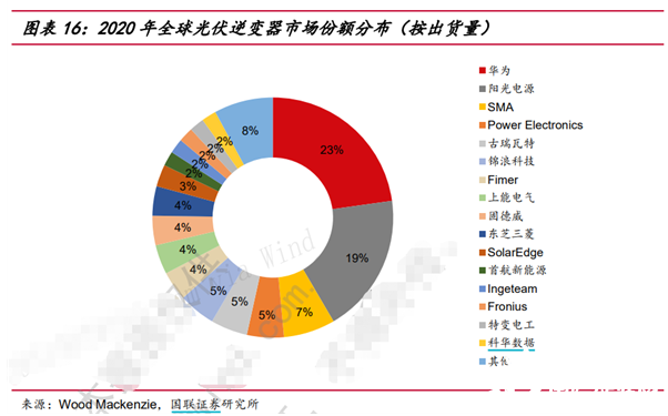 據(jù)Wood Machenzie,2020年全球光伏逆變器企業(yè)出貨量Top10中國內(nèi)企業(yè)占6席,華為和陽光電源構(gòu)成了全球光伏逆變器企業(yè)的第一梯隊,2020年出貨量分別為41.7GW和35.0GW,占全球出貨量的23%和19%。中國企業(yè)Top6占據(jù)全球光伏逆變器出貨量60%的市場份額,且集中度還在上升趨勢中。