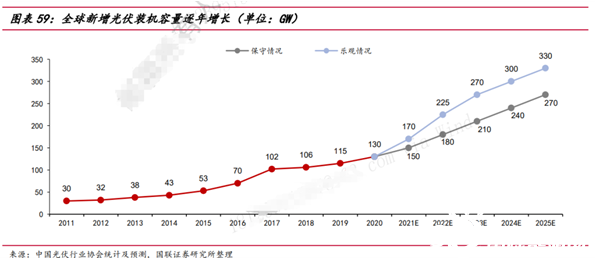 在2020年,全球光伏市場在新冠疫情的影響下依舊實現(xiàn)了加速增長,全年新增裝機量約130GW,同比增長13.0%,全球范圍內(nèi)光伏新增裝機需求持續(xù)提升。受益于光伏裝機量的增長,據(jù)Wood Mackenzie,2020年作為光伏系統(tǒng)的必要設(shè)備,全球光伏逆變器出貨量185.14GW,較2019年大幅增長43%。