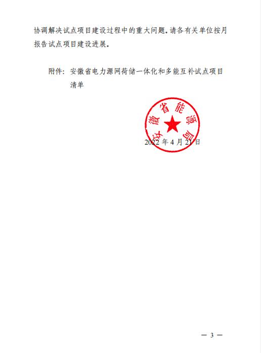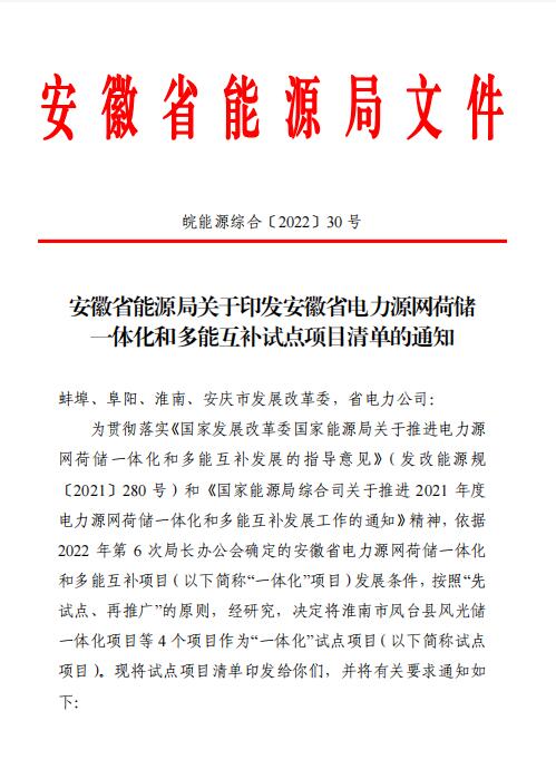 【國際能源網(wǎng) 訊】近日,安徽省能源局關(guān)于印發(fā)安徽省電力源網(wǎng)荷儲一體化和多能互補試點項目清單的通知,將淮南市鳳臺縣風(fēng)光儲一體化項目等4個項目作為“一體化”試點項目,項目規(guī)模共計451萬千瓦,其中2022年下達風(fēng)電光伏發(fā)電建設(shè)規(guī)模共計116萬千瓦。具體如下: