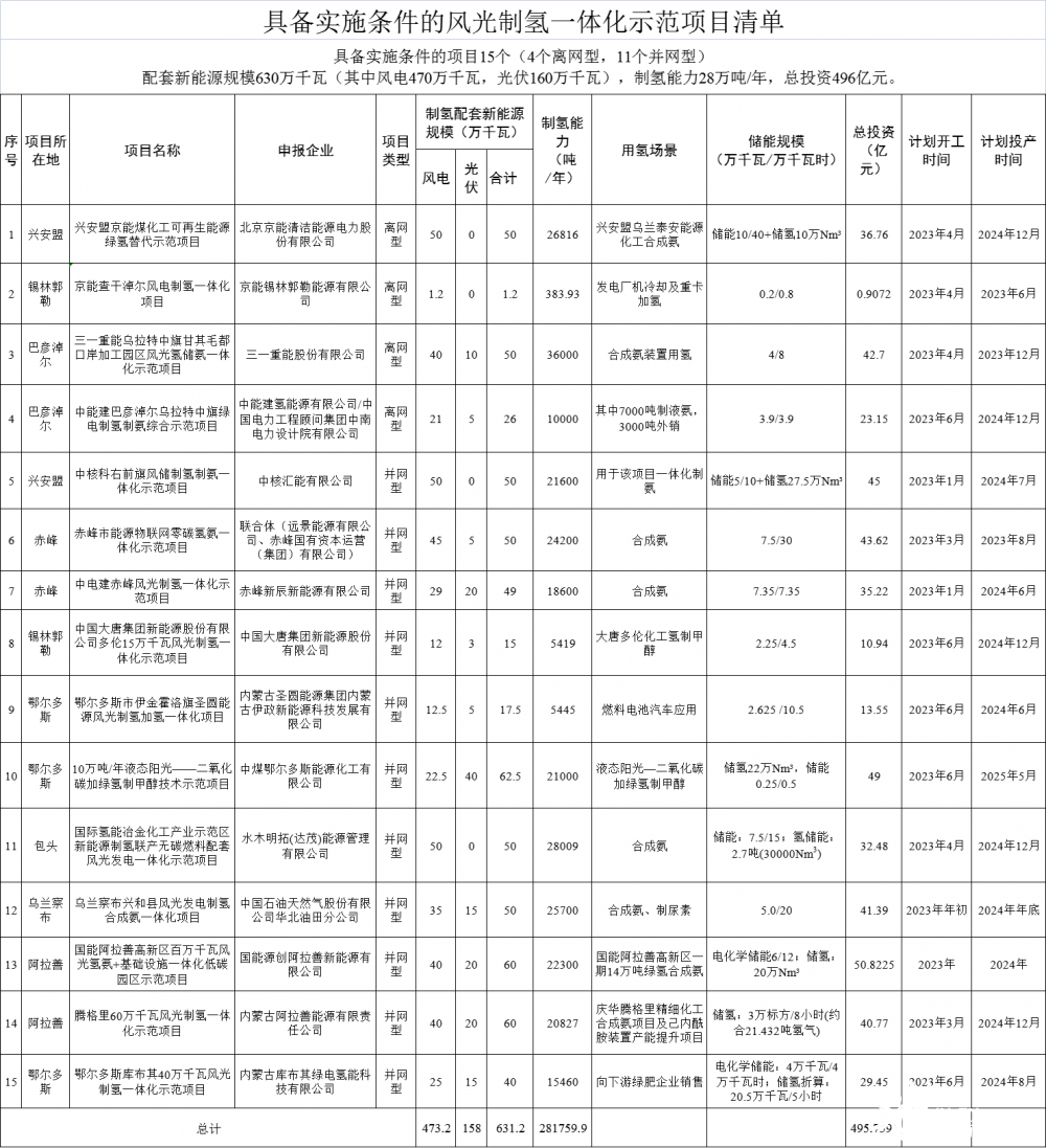 具備實施條件的項目15個(4個離網(wǎng)型,11個并網(wǎng)型),配套新能源規(guī)模631.2萬千瓦(其中風(fēng)電473.2萬千瓦,光伏158萬千瓦),制氫能力28.2萬噸/年,總投資495.8億元(詳見附件)。
