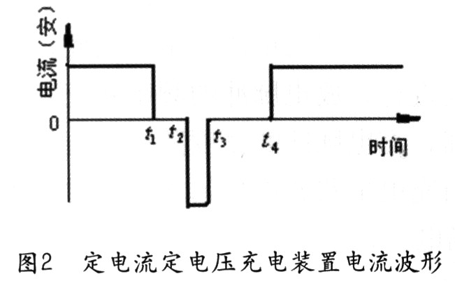 地方上已有這種充電設(shè)備,其工作過程是三相交流電源經(jīng)接觸器、變壓器及可控硅充電開關(guān)對蓄電池充電。待蓄電池電壓達到出氣點電壓時,經(jīng)過電壓傳感器檢測并發(fā)出信號。此信號使充、放電狀態(tài)控制器轉(zhuǎn)為停止充電狀態(tài),并發(fā)出三個控制信號。第一個控制信號是關(guān)斷充電脈沖發(fā)生器的信號。第二控制信號是開始去極化信號,它經(jīng)過放電前停止充電延時電路延時(t1-t2)后,發(fā)出放電開始脈沖,打開放電開關(guān),蓄電池開始向放電電阻放電并經(jīng)過放電延時電路延時(t2- t3)后,發(fā)出放電關(guān)脈沖,結(jié)束放電。依次重復(fù)進行充放電過程,直至充電結(jié)束。第三個控制信號送給開始放電計時器,使其從第一次去極化放電開始計時,到預(yù)定的時間后結(jié)束充電,自動關(guān)機。用這種方法充電,蓄電池的充電和放電電流波形如圖2所示。上述兩種方法是蓄電池充電方法的改進方向。我國采用的快速充電方案很多,性能差異很大。各種充電方法對蓄電池的壽命影響也大不相同。這兩種方法在理論上比較適合對蓄電池充電的要求。