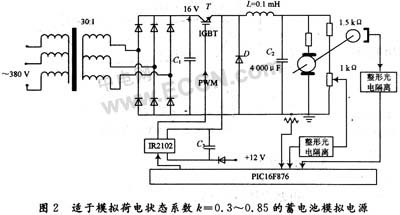 上面討論的是荷電狀態(tài)系數(shù)k=0.3~0.85所對(duì)應(yīng)的情況,在這一區(qū)間內(nèi),可認(rèn)為蓄電池的內(nèi)阻Ri是常數(shù)。對(duì)于k<0.3的情況,隨k值的下降,內(nèi)阻Ri會(huì)急劇上升。這一狀態(tài)也可由模擬電源近似模擬:使開(kāi)關(guān)管T1的PWM脈寬隨k值一起下降,一方面造成電壓的下降,同時(shí)由于也使整個(gè)線路的開(kāi)關(guān)損耗增大,這相當(dāng)于增加了蓄電池的內(nèi)阻。不過(guò)這樣得到的Ri值與蓄電池的實(shí)際內(nèi)阻可能有相當(dāng)?shù)牟罹?,因此k<0.3的情況不適宜使用。